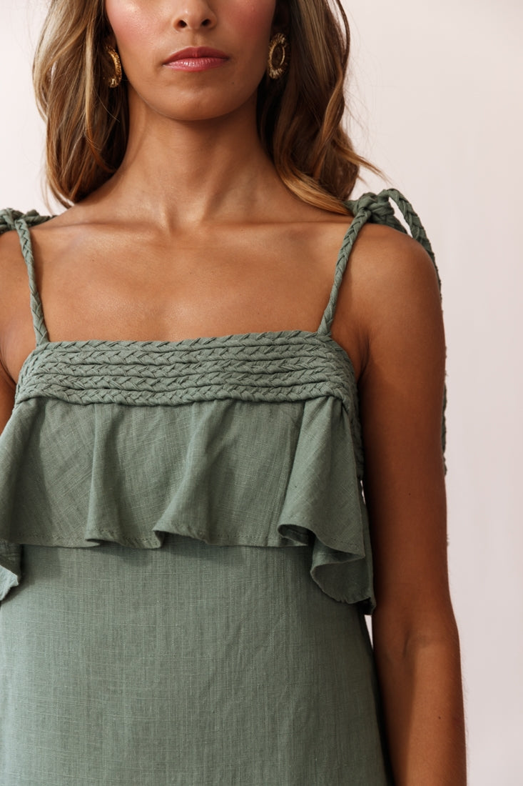 Breeze through your day in our pretty West dress. Featuring a layered ruffle bust with braid detailing, braided rope tie-up shoulders, pockets and a zipper up the back. Perfect for a weekend getaway teamed with tennis shoes and a basket bag.