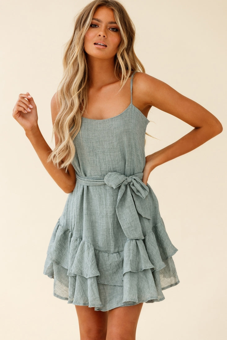 Turn heads wherever you go in this super cute dress featuring spaghetti straps, a tiered ruffle hemline and belted tie around the waist. We are loving the soft, floaty fabric. Perfect for lunch with your gal pals or a day at the mall! Team it with your favorite wedges or pointed-toe flats and a tote. Style queen!