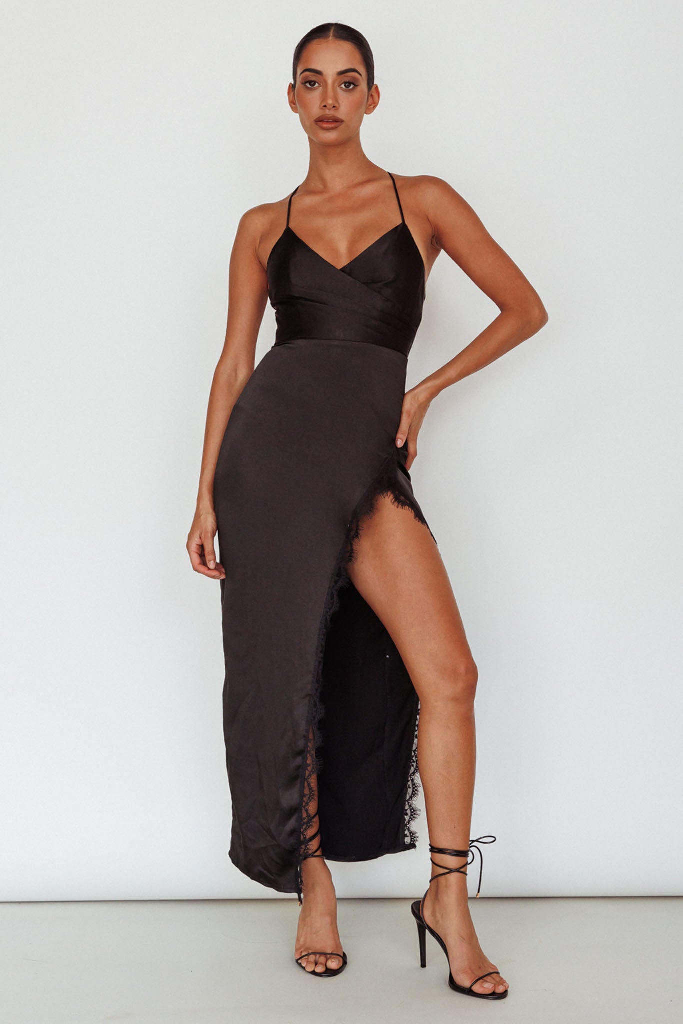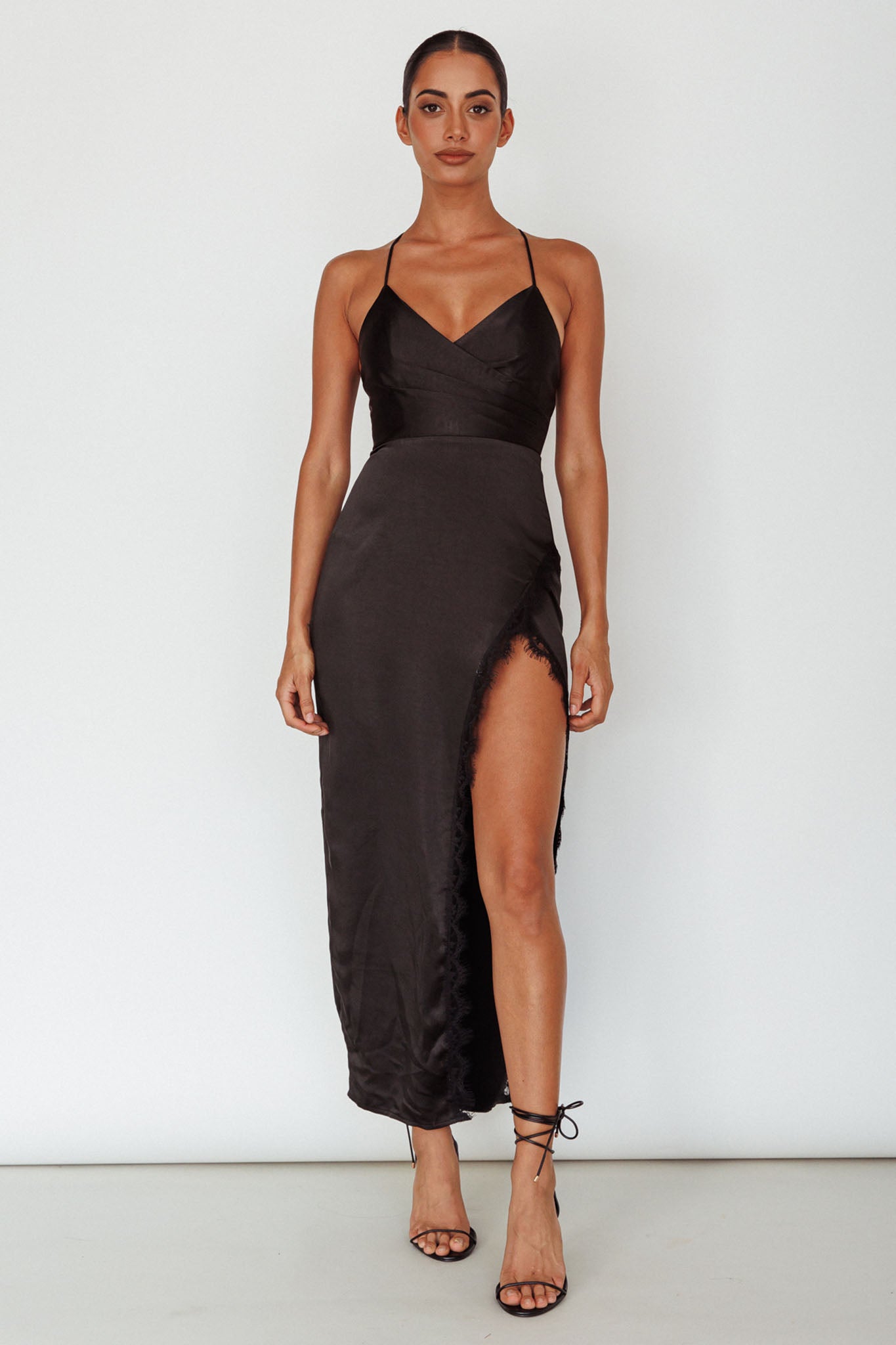 Steal the spotlight in our stunning Winter Moon midi dress. Featuring a split in the front with eyelash lace trim. It's perfect for prom or a special gala event. Team it with black, strappy heels and a purse for an unforgettable look.