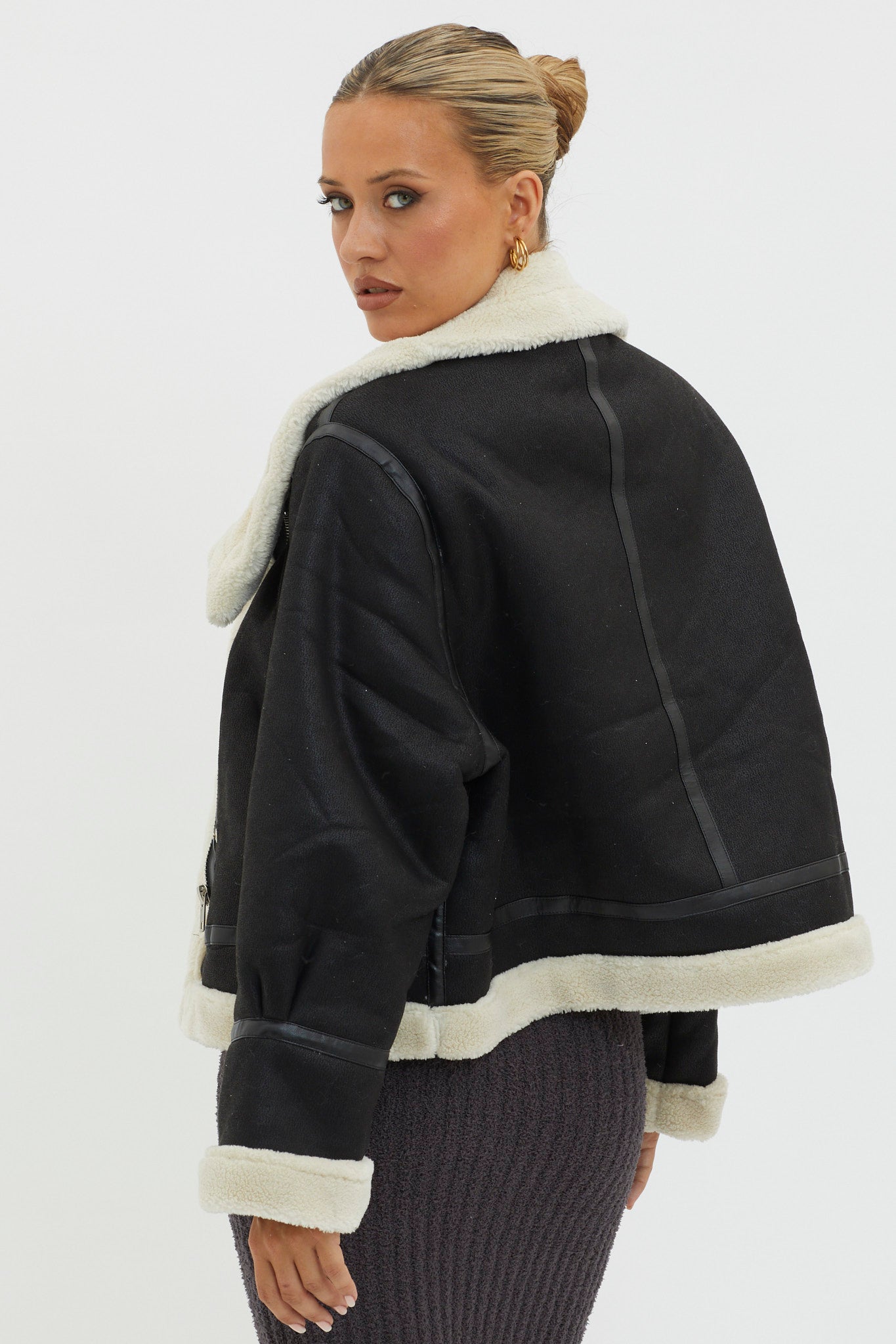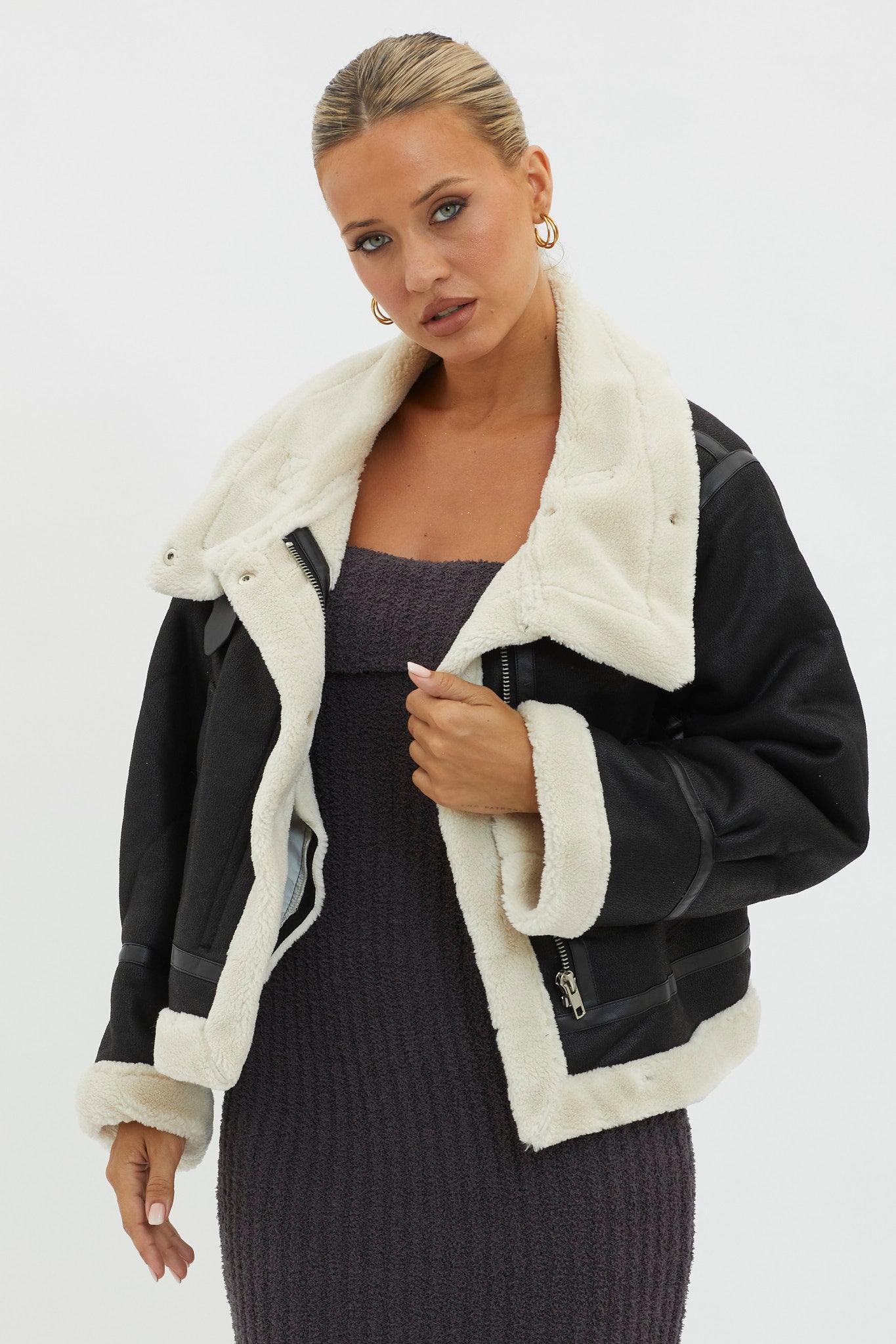 Channel your inner It Girl in our cozy but ultra cool Wintertide jacket. It features a sherpa lining and trim and zipper closure. It's perfect for your nine to five or dinner dates with your girls. Dress it up or down with an LBD and tights or your fave mom jeans and bodysuit for an on-trend look.