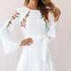 Hot Hippie! Soft fabric on this blush colored mini dress is a beautiful solution to the floral embroidered flowers along the shoulders and necklines. Wear with nude heels.