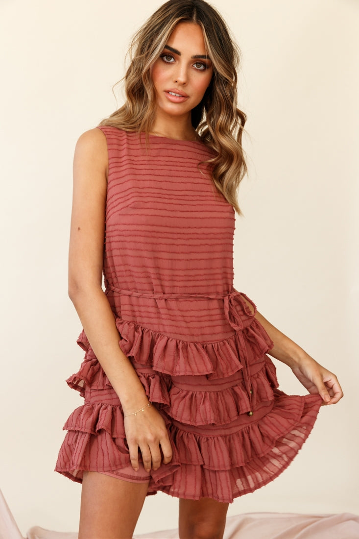 Turn heads in our pretty Zayah dress. Featuring a sleeveless design, layered frill skirt and string-tie with goldden toggles around the waist. Perfect for a lunch date teamed with boots and a tote. Super cute!
