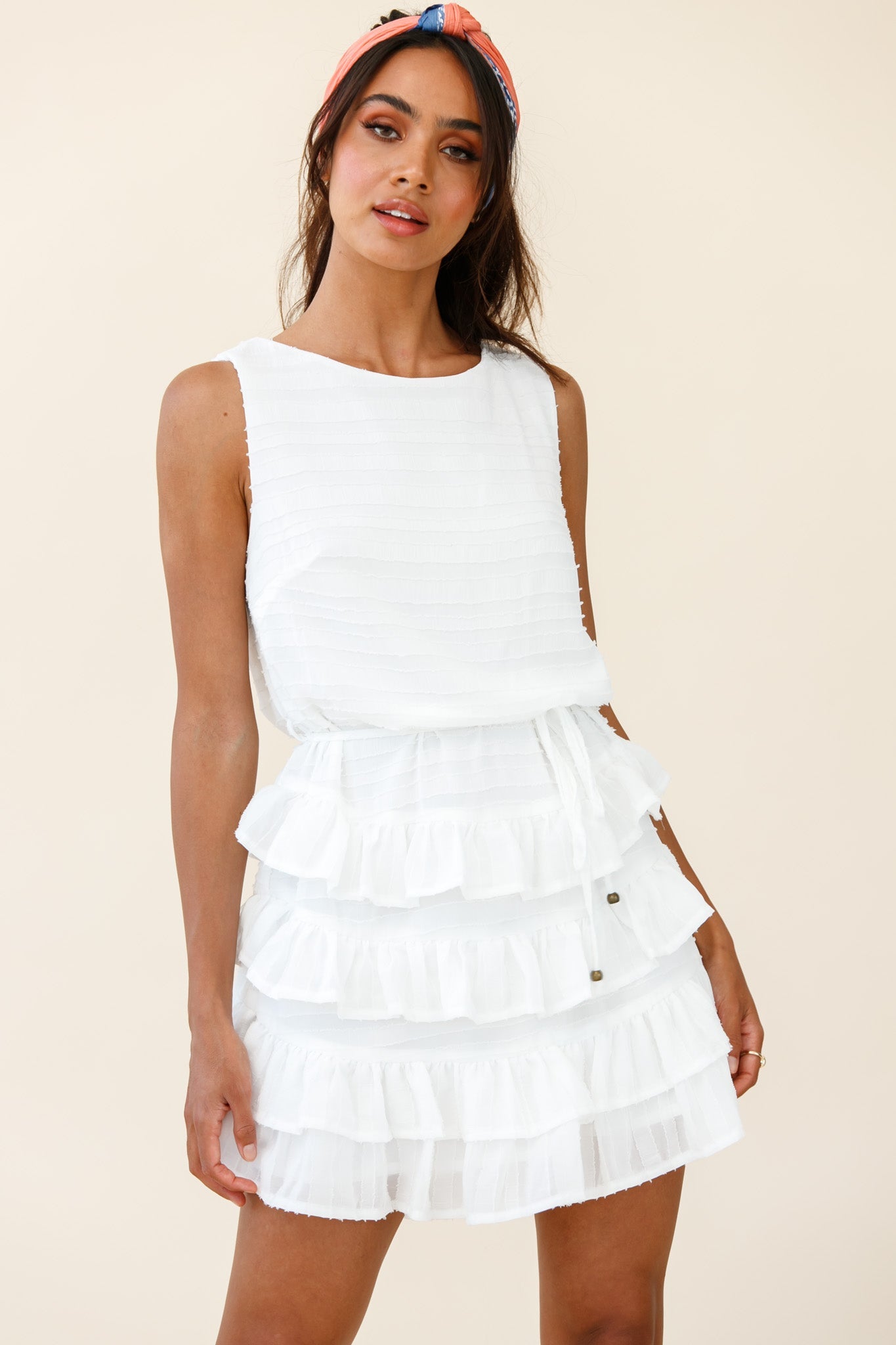 Turn heads in our pretty Zayah dress. Featuring a sleeveless design, layered frill skirt and string-tie with goldden toggles around the waist. Perfect for a lunch date teamed with wedges and a tote. Super cute!